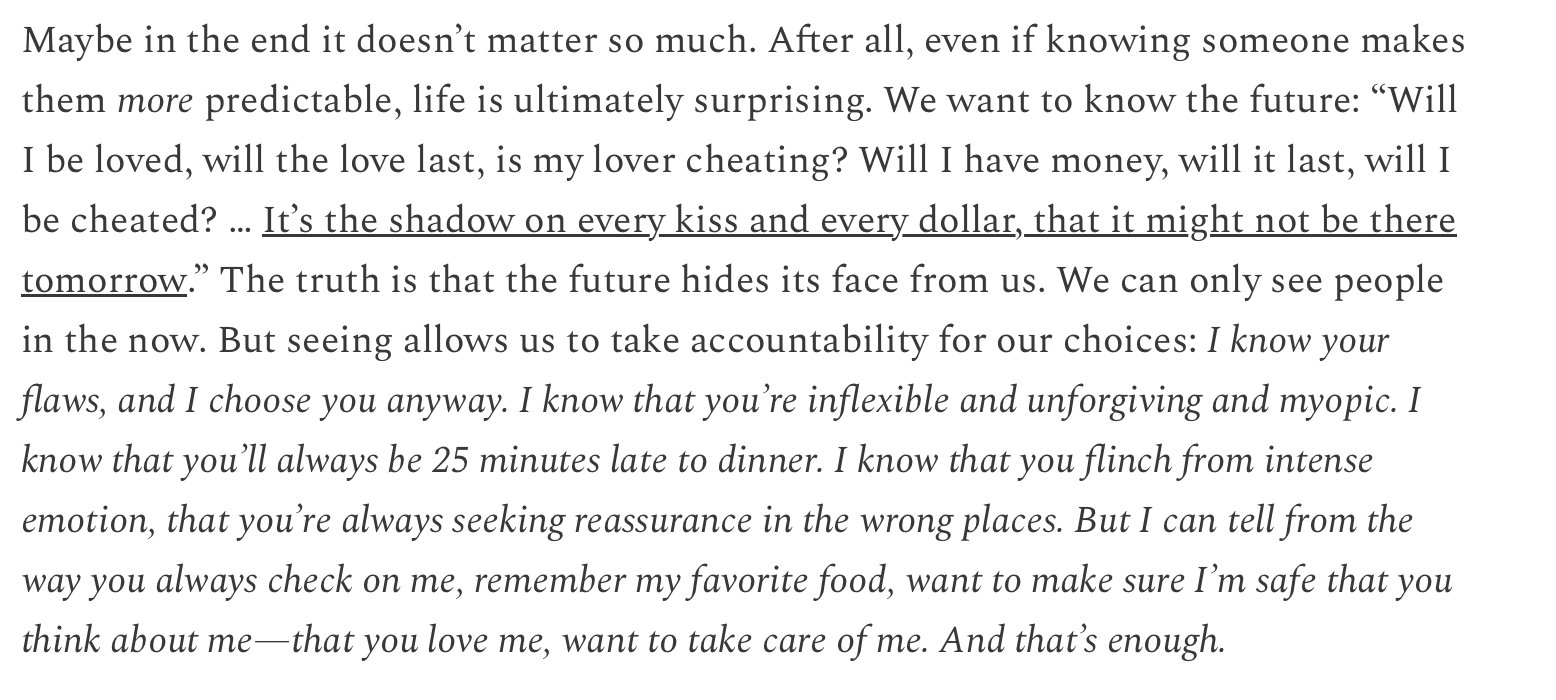 I don’t think it’s specific to love (and my insecurity from it is definitely not limited to love), but it’s kind of insane to think about romance in this manner. It’s mildly impressive that anyone ever can fall in love — the level of commonality required is absurd. For a successful relationship, one must admire each other at the same time, be in roughly the same city, have a similar upbringing, social class, aligned future growth/plans for the next 5 years, etc. And that you can have all of this, and some black swan happens, and whoopety doo it’s all you can think about for the rest of your life. The dimensionality of relationships is absolutely absurd; you’re trying to find your k-nearest-neighbours in 100-dimension search; and to think that dating apps reduce this to a 2-sentence bio and curated pictures?!
