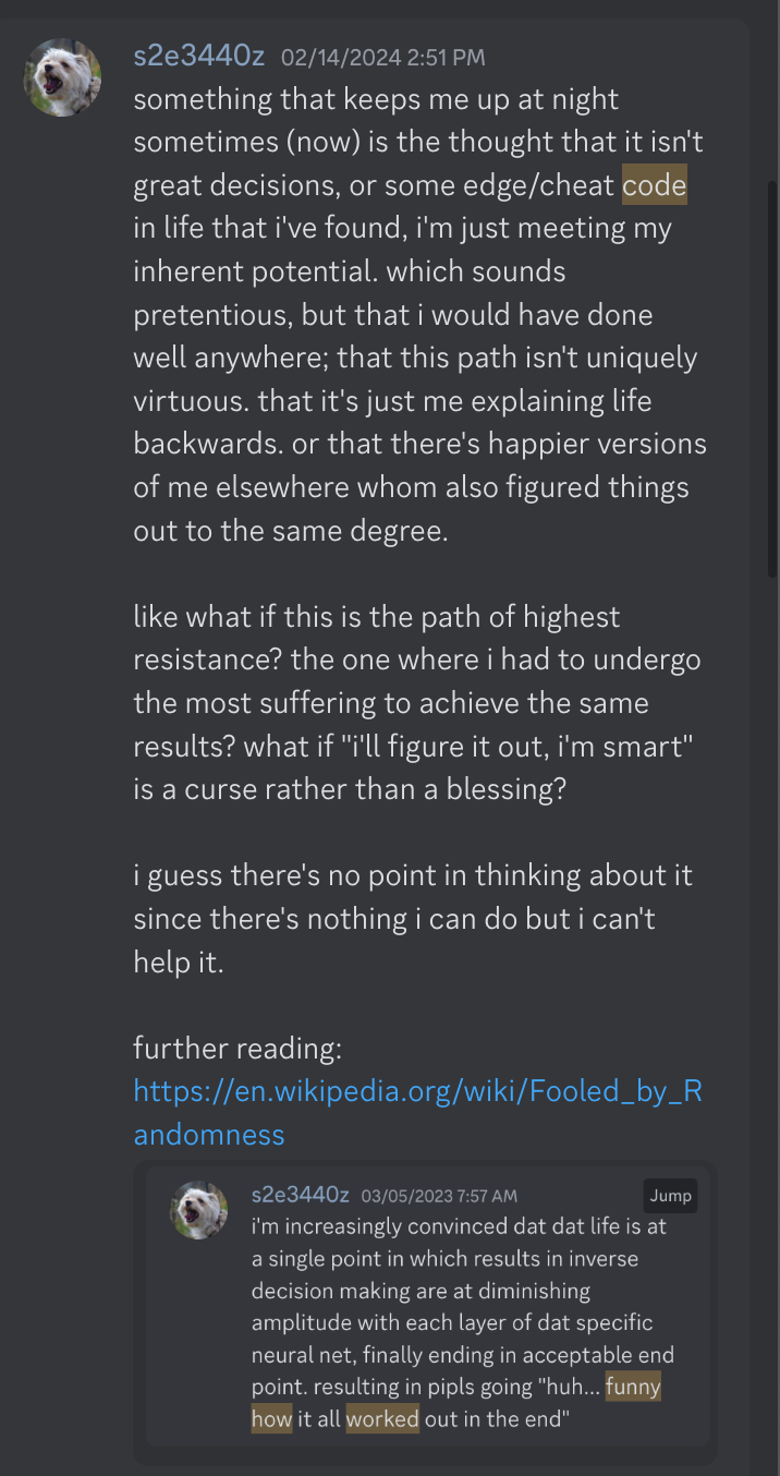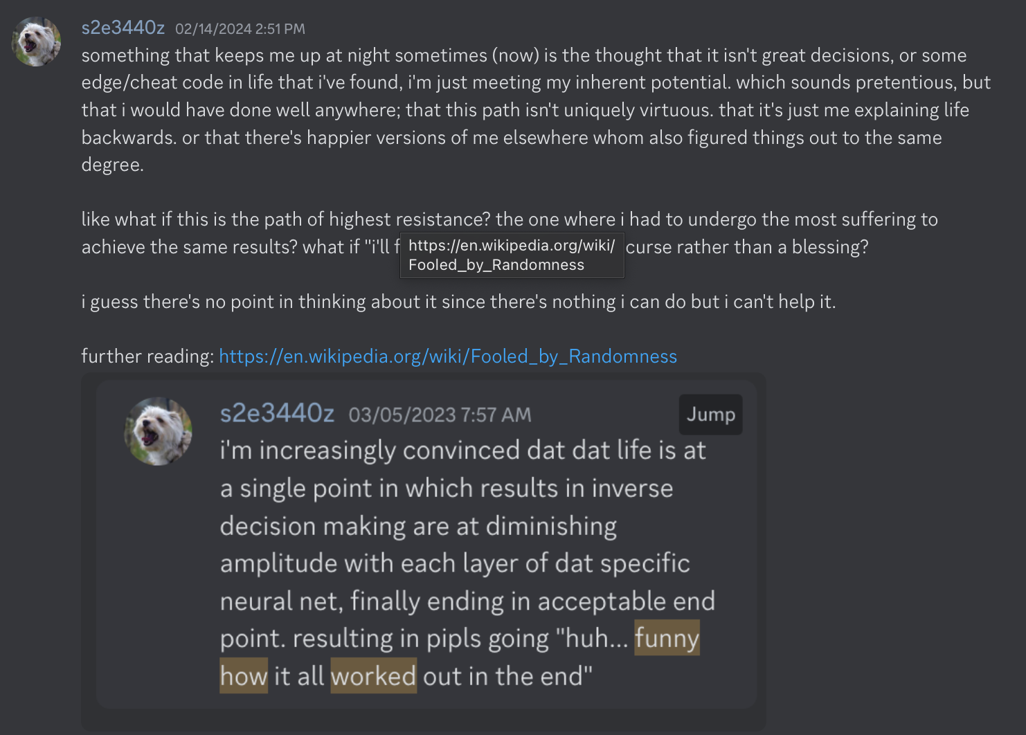 talking with Trinh about Justin’s abundance mindset and how he convinced me to entertain their offer in late 2023 with “but what if it goes right”, after I sent him a list of cons (he reacted with “yah ur not wrong on any of these lmao”)